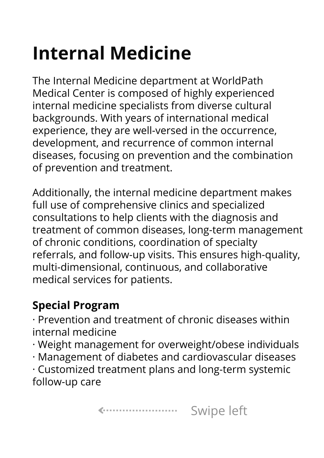 We have carefully designed a dedicated health check pathway, where clients are accompanied by a personal nurse throughout the process. In the VIP lounge, a senior medical team will provide comprehensive health checks and assessments.