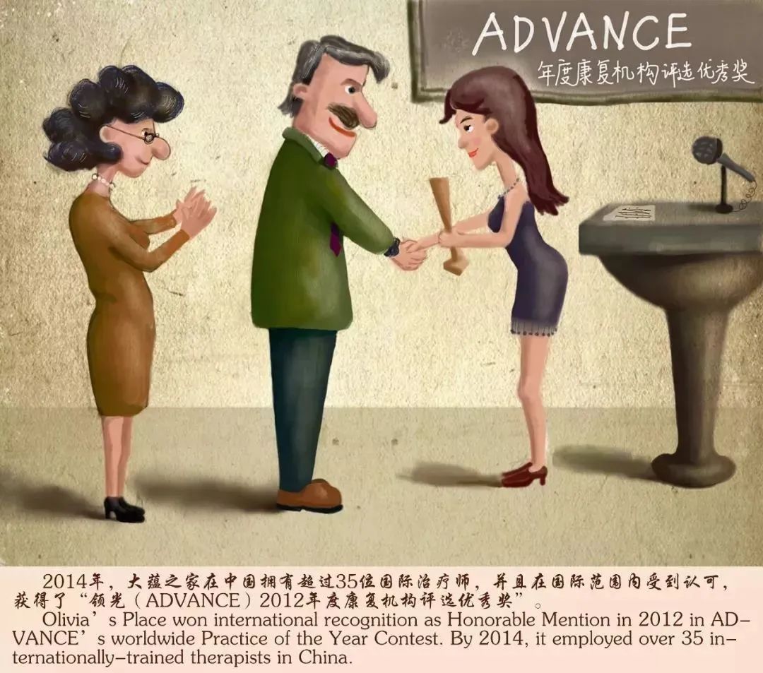 Olivia's Place was founded in 2010, and is named after the founders' daughter (Olivia) who has Down Syndrome. Living in Shanghai as American expatriates at the time of her birth, Olivia's parents struggled to find appropriate therapies for her. During this time the joined a support group for parents of children with special medical or educational needs. Working together with other parents to find and establish connections with various therapists, they saw the need for a unified therapy consulting center catering to international and domestic needs.