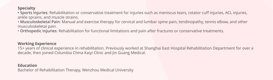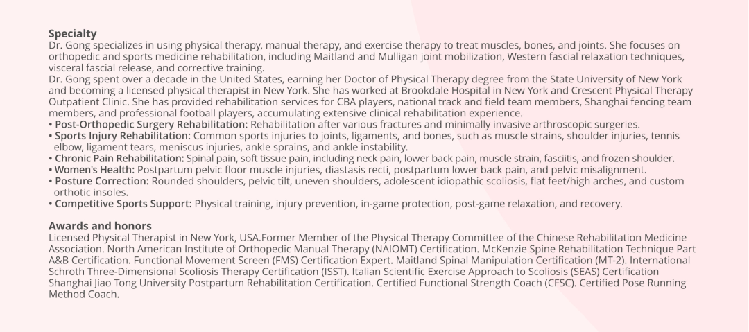 At Am-Sino Healthcare, our sports rehabilitation team follows an international treatment philosophy based on the standards of the American Physical Therapy Association (APTA). Led by Dr. Gong Shuna, a rehabilitation specialist for national team athletes, we combine expertise in sports medicine and rehabilitation with evidence-based practices. We offer personalized performance enhancement plans, effective injury prevention strategies, treatment options, and tailored rehabilitation programs for every patient.